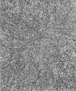 Allover-Verfahren mit Tusche Zeichen und Linien aufgetragen hat.